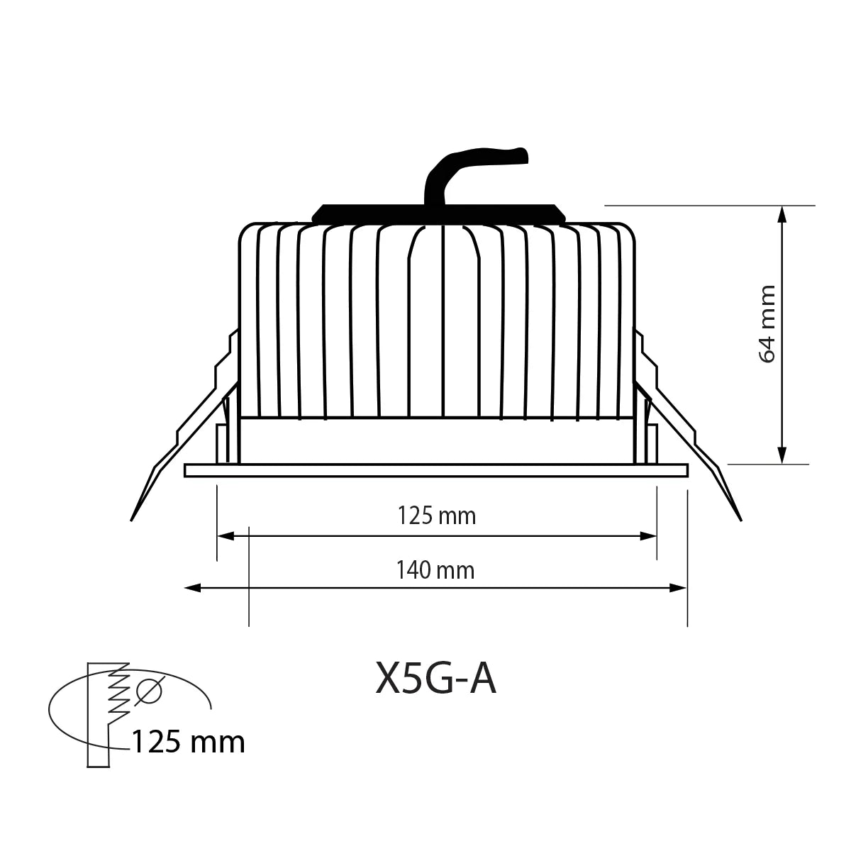 Cut out 125mm, size 140 x 64 mm(H)
